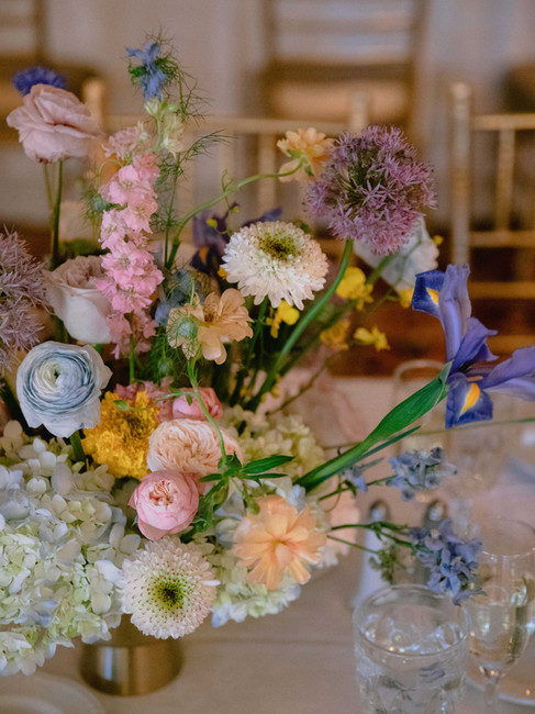 At Westbury Manor, the floral design unfolds in shades of blue and white — a palette that speaks of stillness, air, and reflection. The manor’s architecture, with its soft light and textured stone, invited a composition that feels both historic and weightless. The floral arrangements were built on contrast: deep delphinium and sky-blue hydrangea against ivory roses and pale lisianthus, bound by airy greenery. Each arrangement carries a sense of rhythm — not rigid, but intentional, echoing the quiet movement of garden breeze.